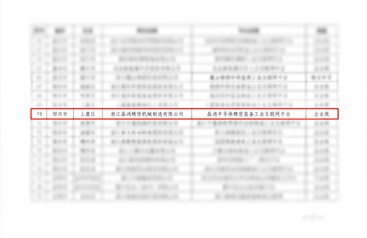 近日,浙江省经济和信息化厅公布了2023年度省级工业互联网平台创建名单,晶鸿半导体精密装备工业互联网平台成功上榜。